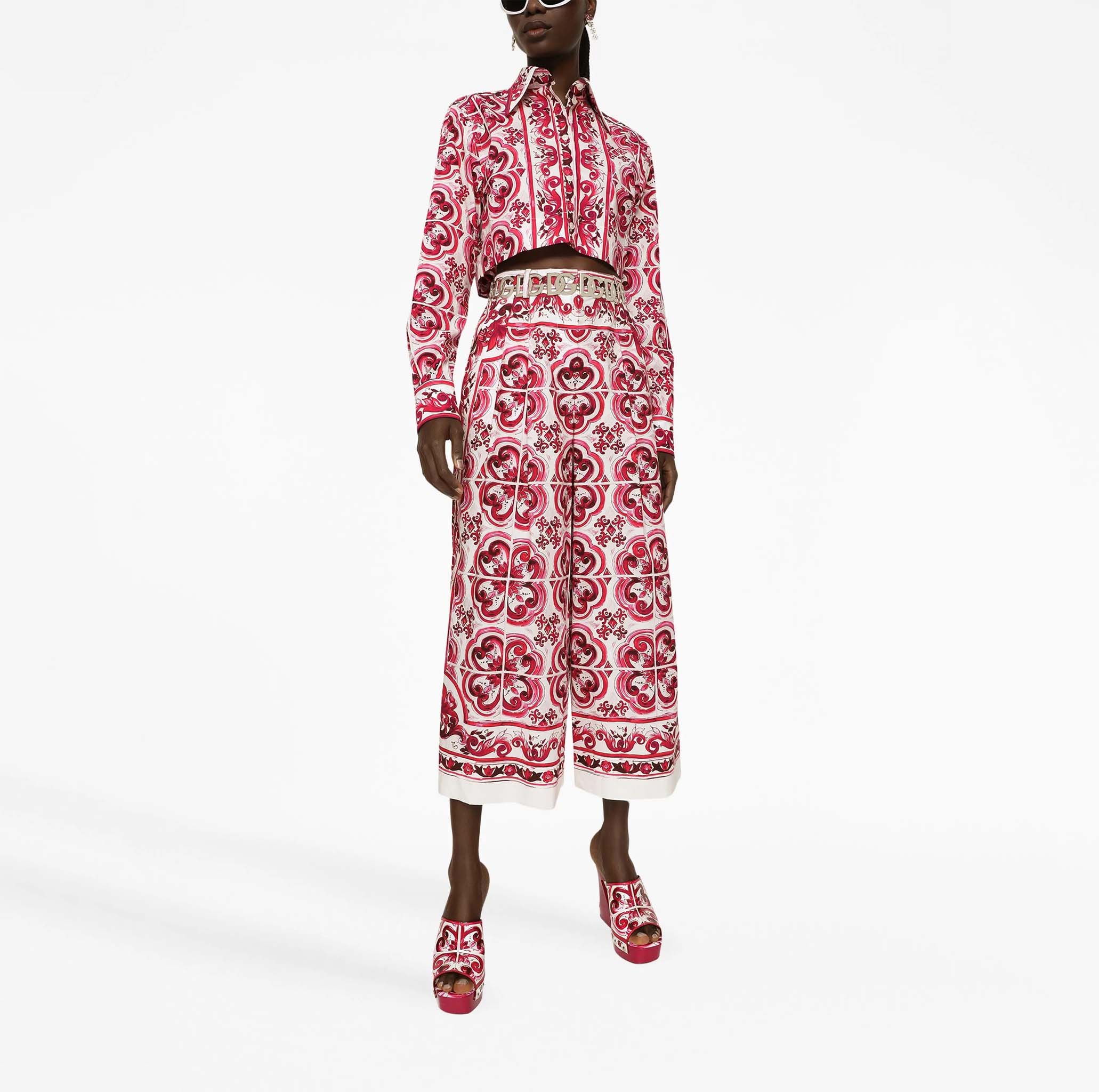 A contemporary silhouette in a Majolica tile-inspired print defines these Dolce & Gabbana trousers. Crafted from cotton, the pair sit high at the waist and flow into cropped wide legs silhouette for timeless appeal.