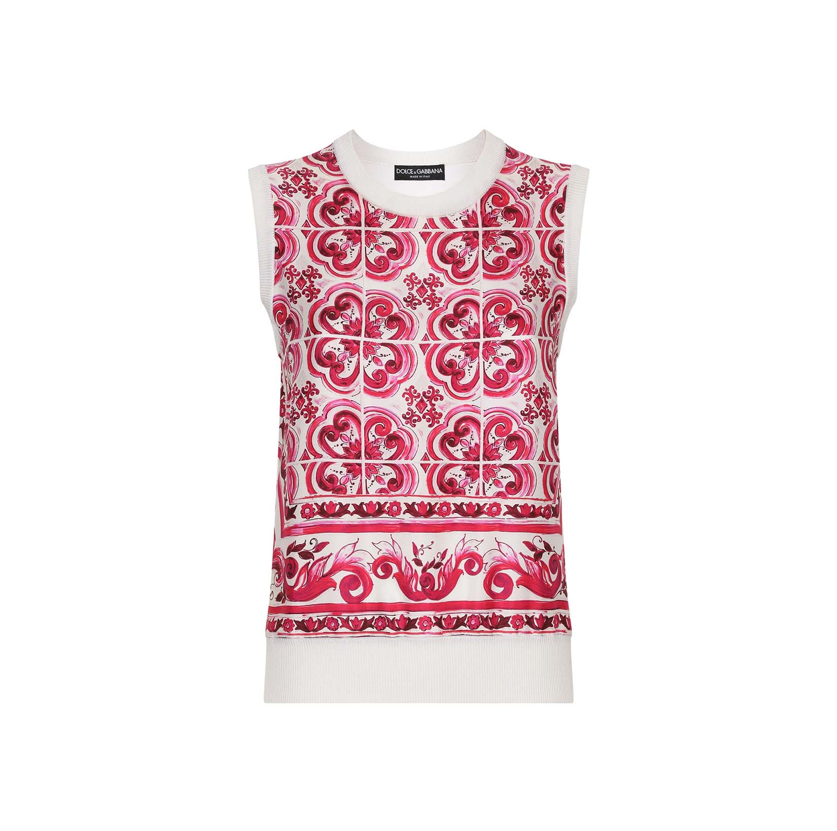Drawing inspiration from the artwork seen on pottery in the Mediterranean, Dolce & Gabbana’s custom Majolica print saturated this tank top. Rendered in a pink, white and red palette, the motif reflects the house's Sicilian heritage.